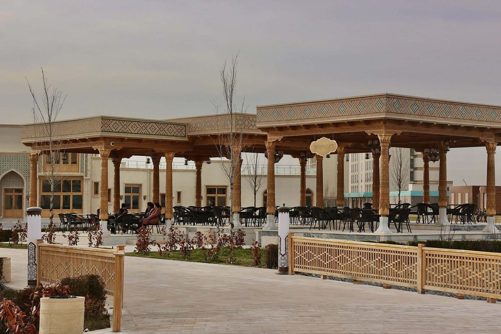 The cafe serves Fergana pilaf cooked by local chefs. Guests may be comfortably accommodated on one of three cozy terraces.